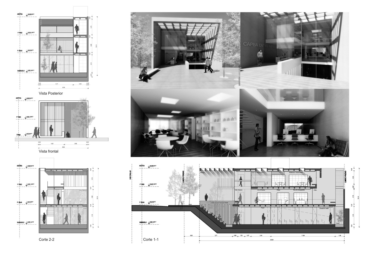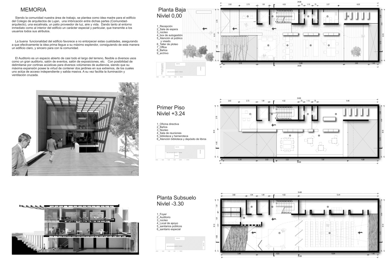 Siendo la comunidad nuestra área de trabajo, se plantea como idea madre para el edificio del Colegio de Arquitectos de Luján, una imbricación entre dichas partes (comunidad – arquitecto), una escalinata, un patio proveedor de luz, aire y vida. Dando tanto en el entorno inmediato como al interior del edificio un carácter especial y particular, que transmite a los usuarios todos sus atributos.