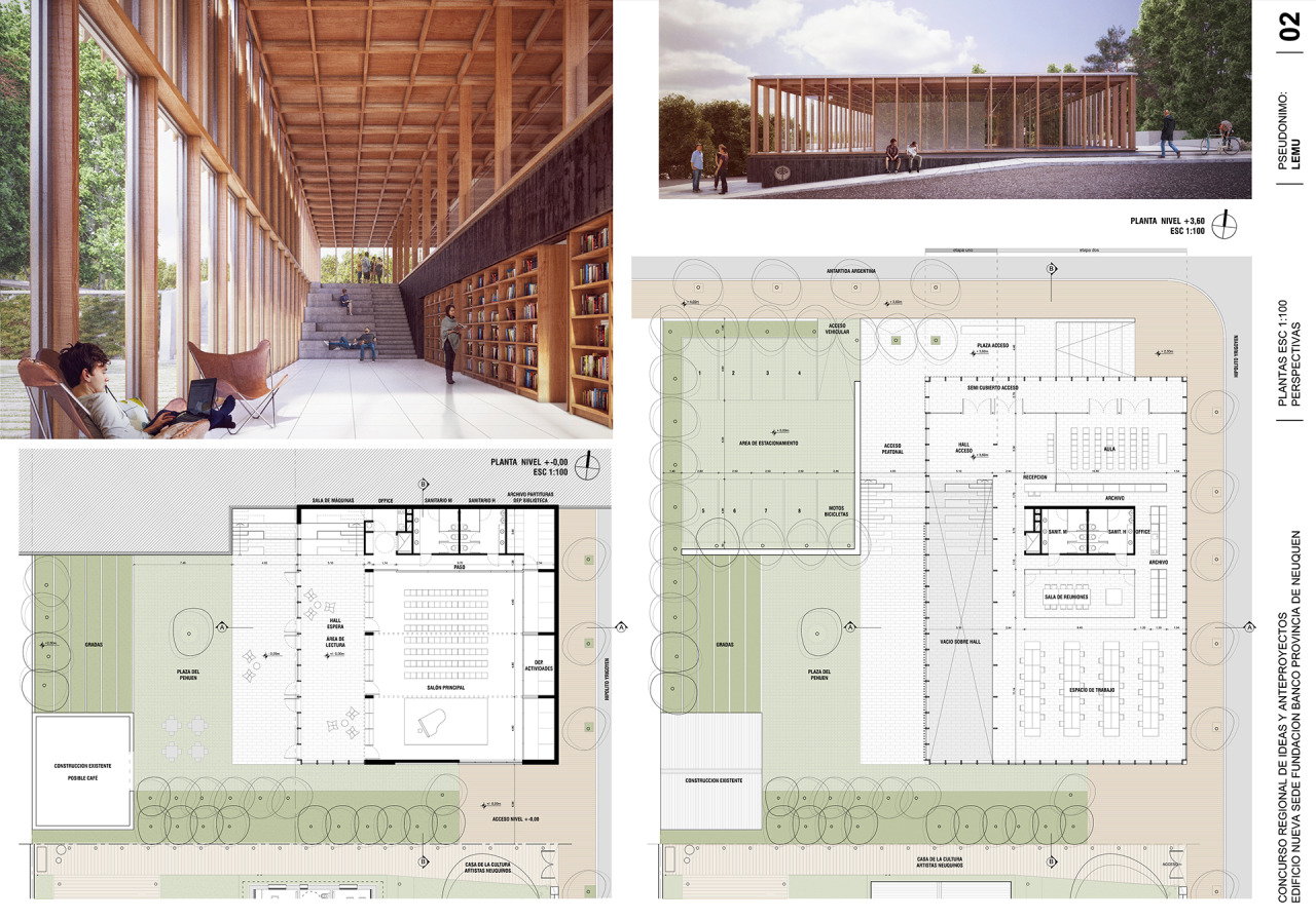 La Plaza del Ciprés en la contigua Casa de las Culturas “Artistas Neuquinos” es el segundo polo de actividades exteriores, que el edificio de la Fundación también consolida mediante la apertura del Salón Multipropósito hacia ese sector. Esta decisión soportará la posibilidad de organizar actividades conjuntas entre ambas instituciones.