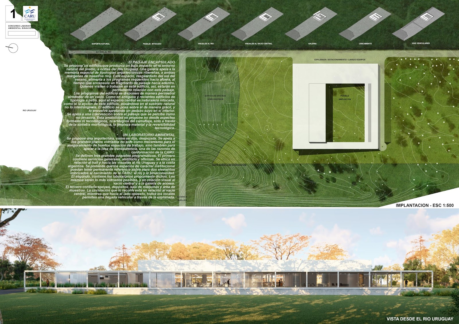 Se propone un edificio que produzca un bajo impacto en el entorno natural del predio, a orillas del Río Uruguay. Una galería apela a la memoria espacial de tipologías arquitectónicas ribereñas, a ambas márgenes de nuestros ríos. Este espacio, resguardado del sol del mediodía, alimenta a los programas requeridos hacia afuera, al tiempo que encapsula un fragmento de paisaje hacia adentro. Quienes visiten o trabajen en este edificio, así, estarán en permanente relación con este paisaje ribereño.