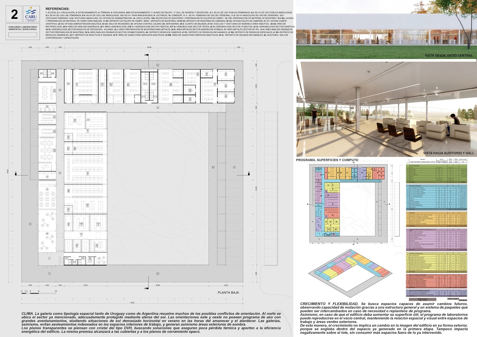 Se definen tres grandes paquetes programáticos. El primero contiene servicios generales, auditorio y oficinas. Se ubica en relación al hall y hacia las visuales al río Uruguay y a la costa argentina. Se pretende que los espacios de carácter institucional puedan tener permanente referencia sobre esos dos elementos imbricados al nacimiento de la CARU: el río y la binacionalidad.