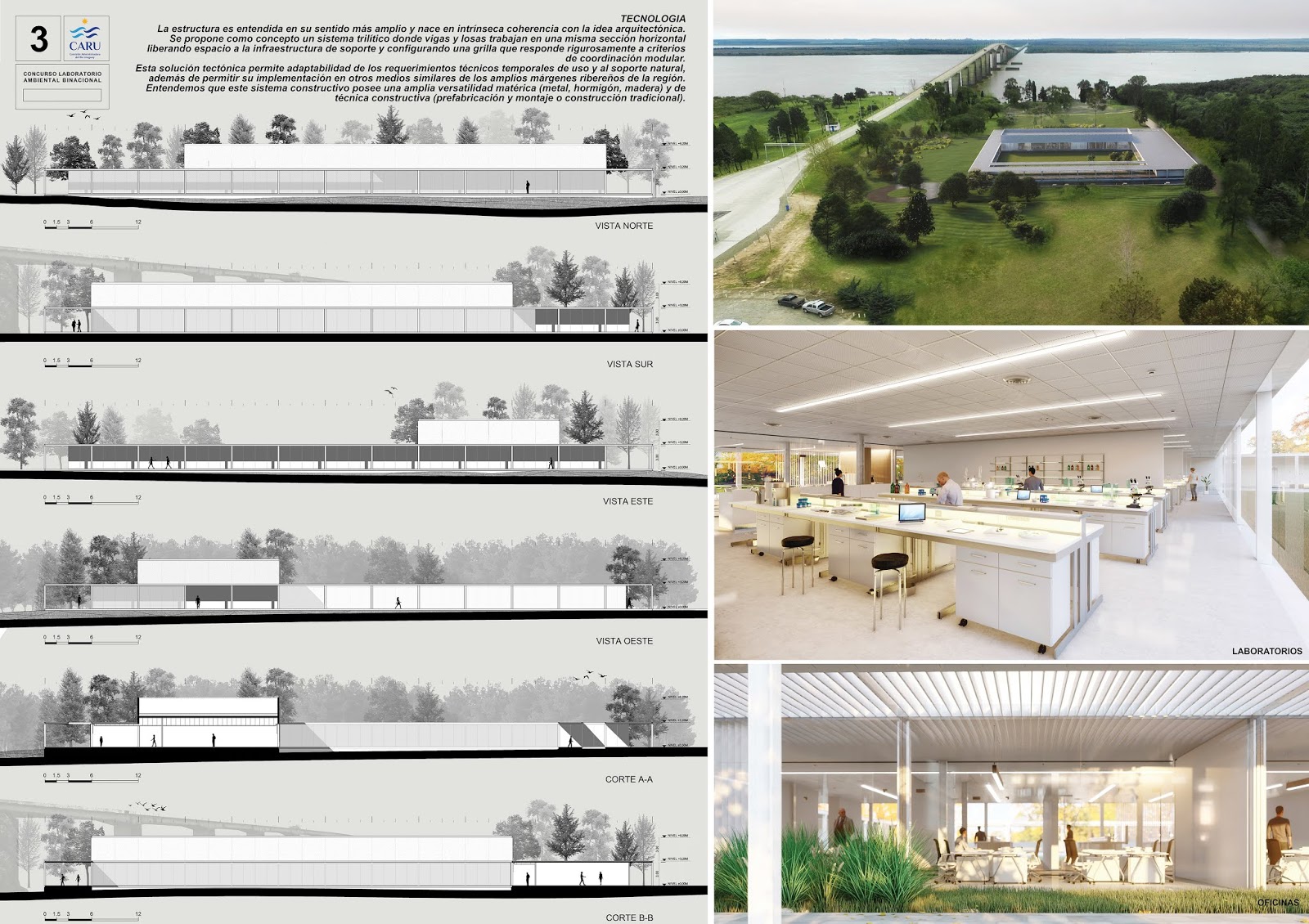 Mención rentada Concurso Binacional de anteproyectos “Laboratorio Ambiental Binacional CARU” – Fray Bentos, República Oriental del Uruguay, 2019.