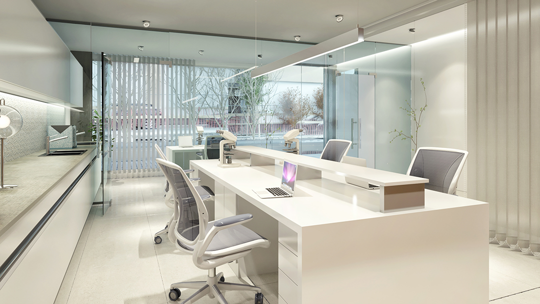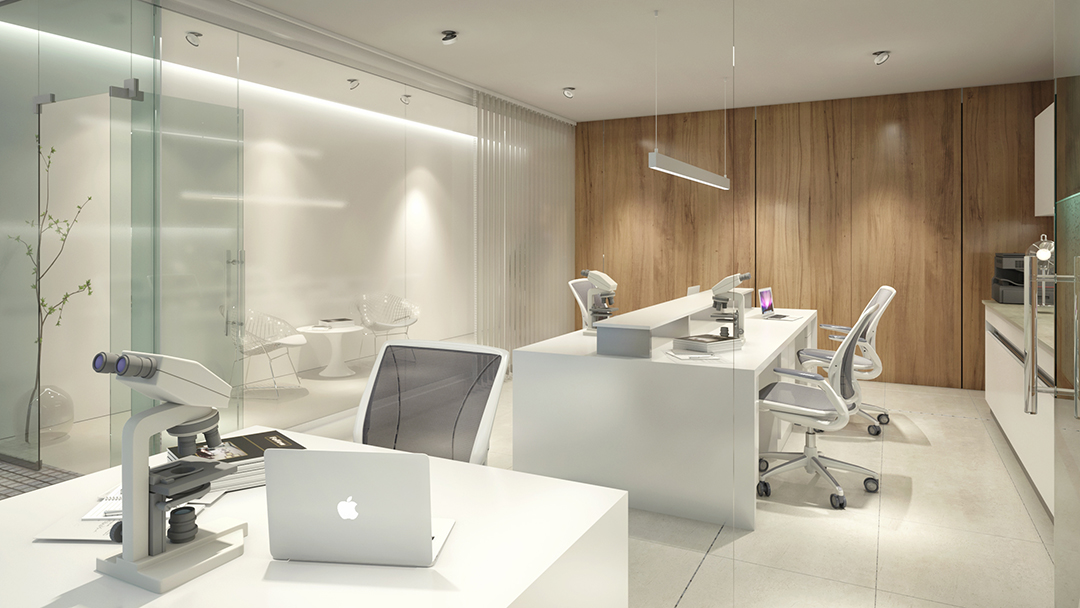 El segundo paquete contiene los laboratorios propiamente dichos. Los mismos serán lo más vidriados posibles, y en relación visual al vacío central y a la galería de acceso.